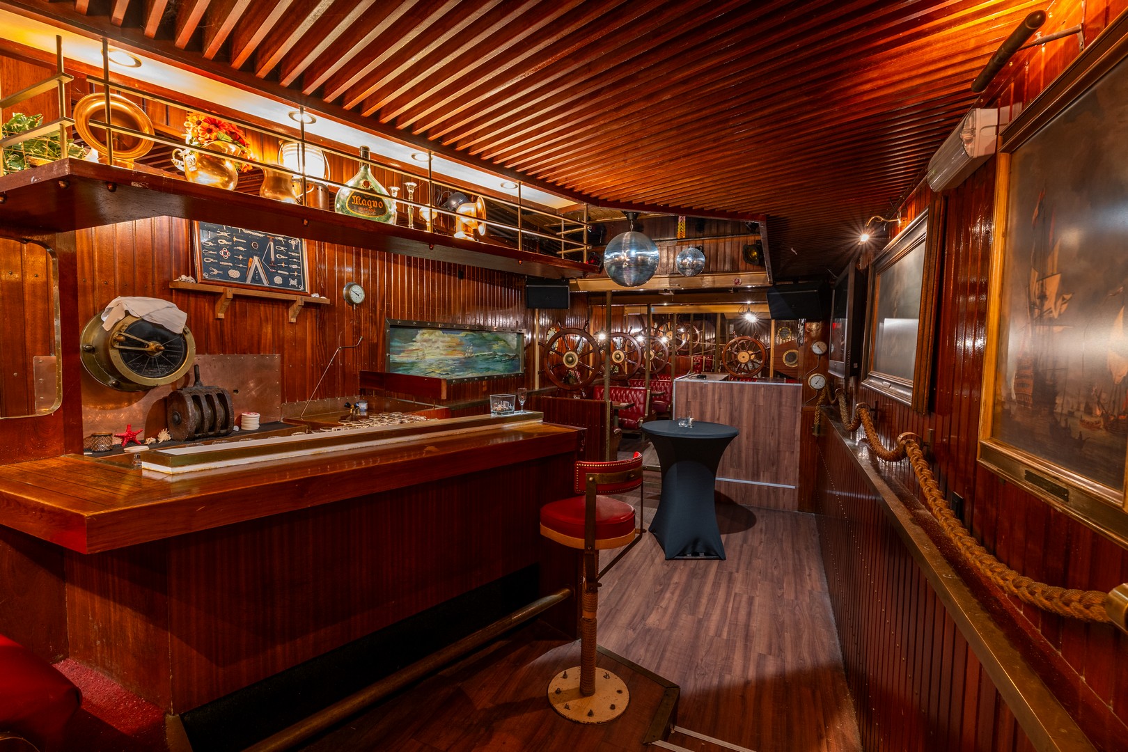 Stap het souterrain binnen en je bevindt je op het onderdek van het schip van de legendarische admiraal Lord Nelson. Deze bar is een absolute beleving: authentiek, sfeervol en uniek in zijn soort. Ideaal voor themafeesten, borrels of intieme bruiloften - met ruimte voor zo'n 90 gasten (maar ook met een kleinere groep voelt het hier knus en bijzonder).